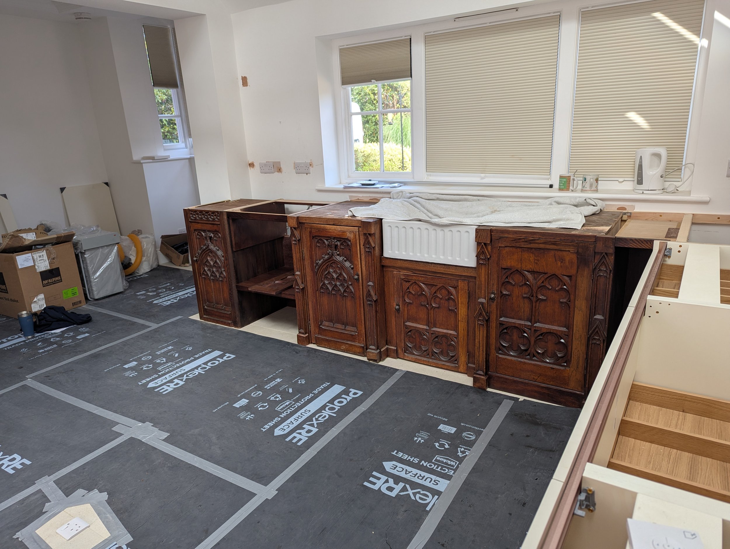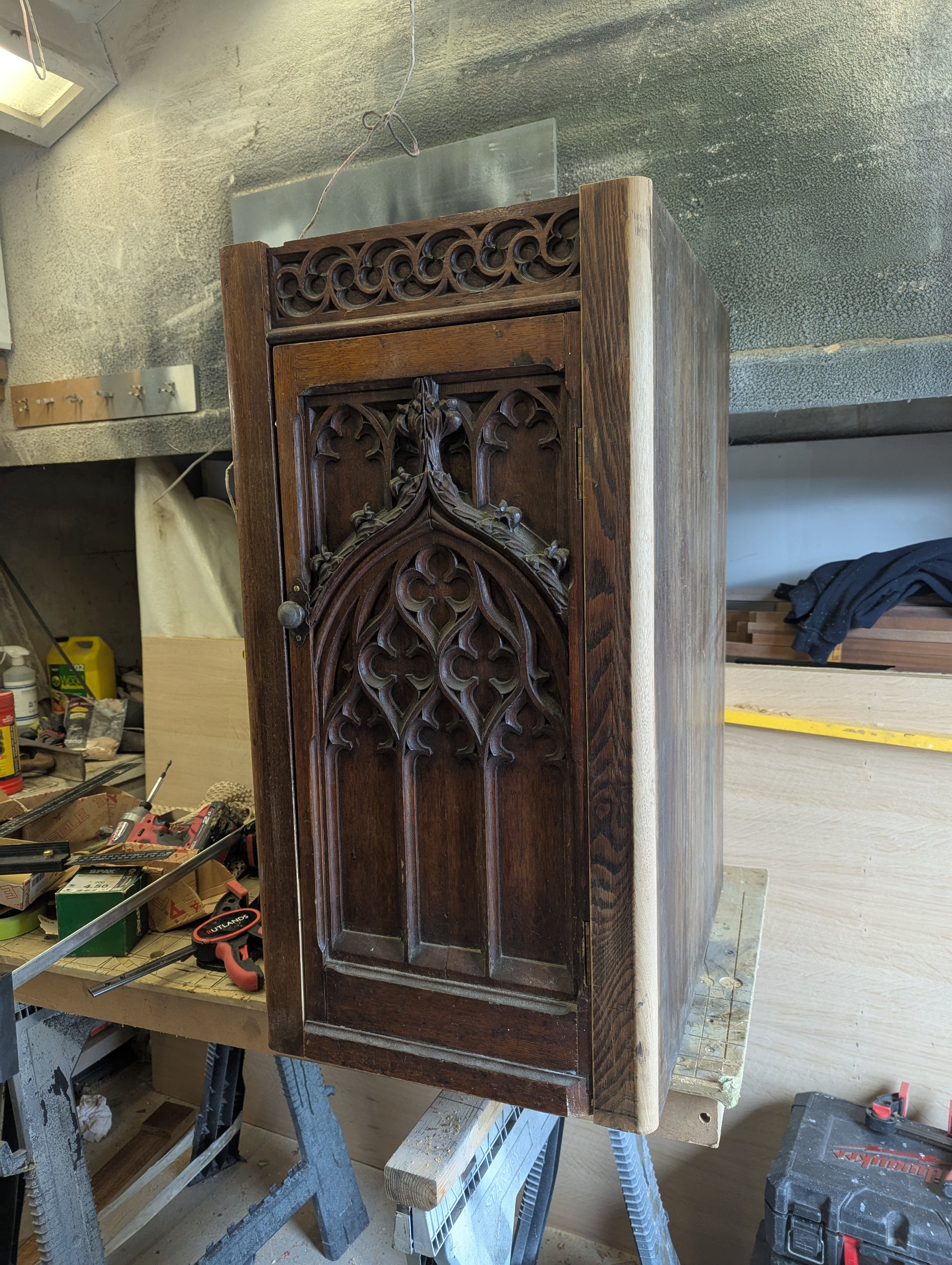 One of the most challenging elements of the project is a large former wall unit from the church, now destined to sit in the centre of the room as a freestanding feature. While the front and one side retain original hand-carved details, the rear and remaining side were never intended to be seen and are completely plain.